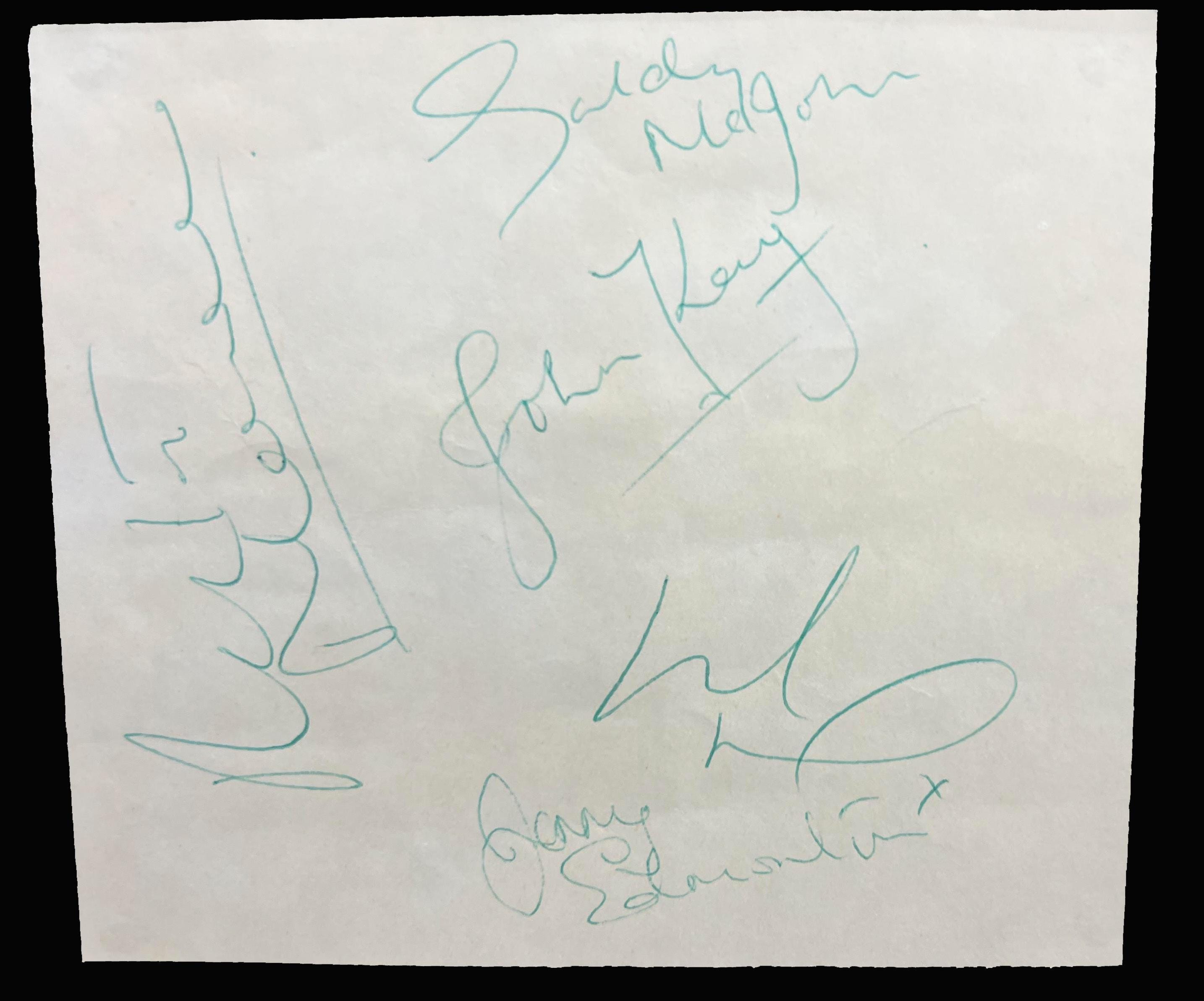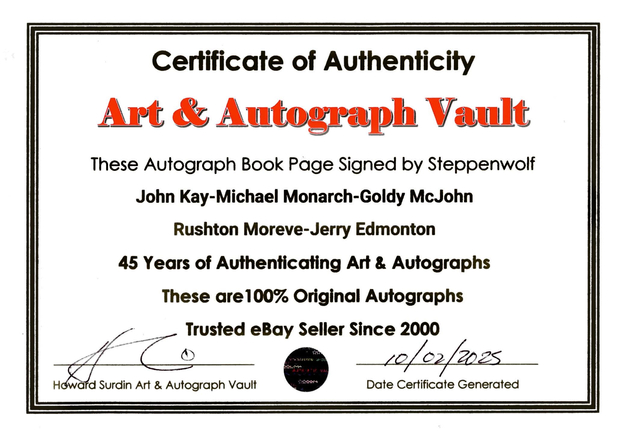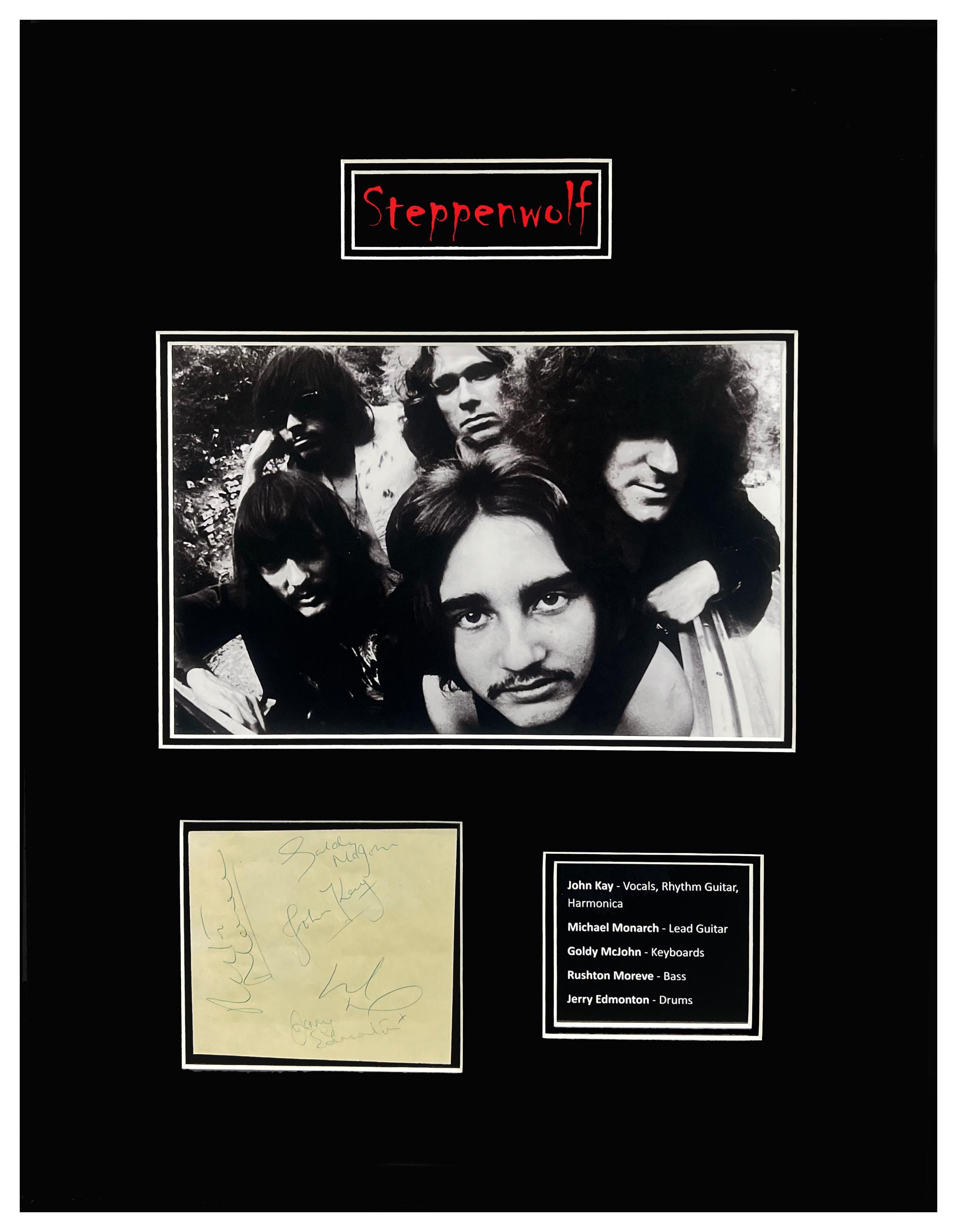 Double matted autograph book page is signed with the original signatures of the following: John Kay-Michael Monarch-Goldy McJohn-Rushton Moreve-Jerry Edmonton