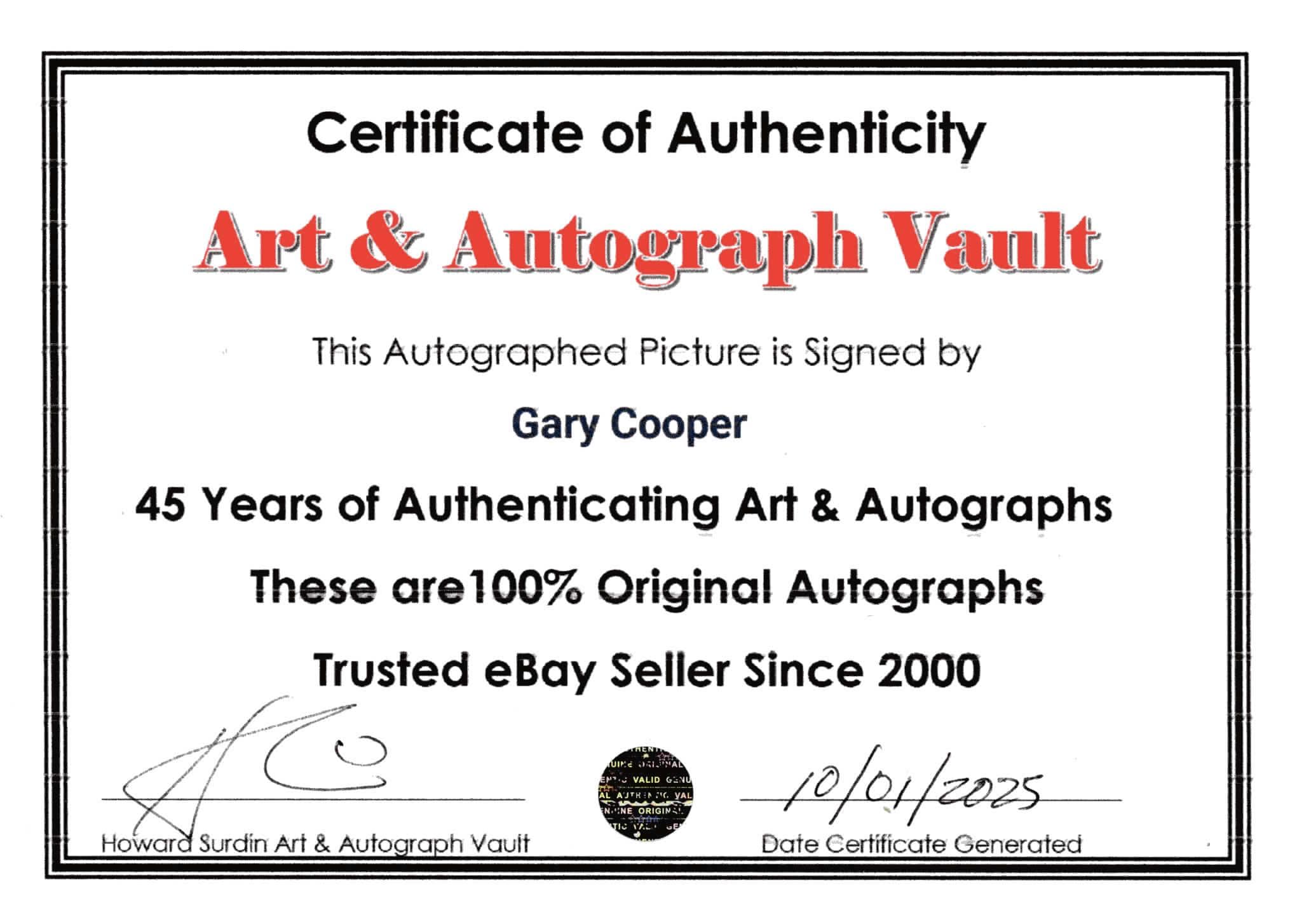 Gary Cooper Signed Picture