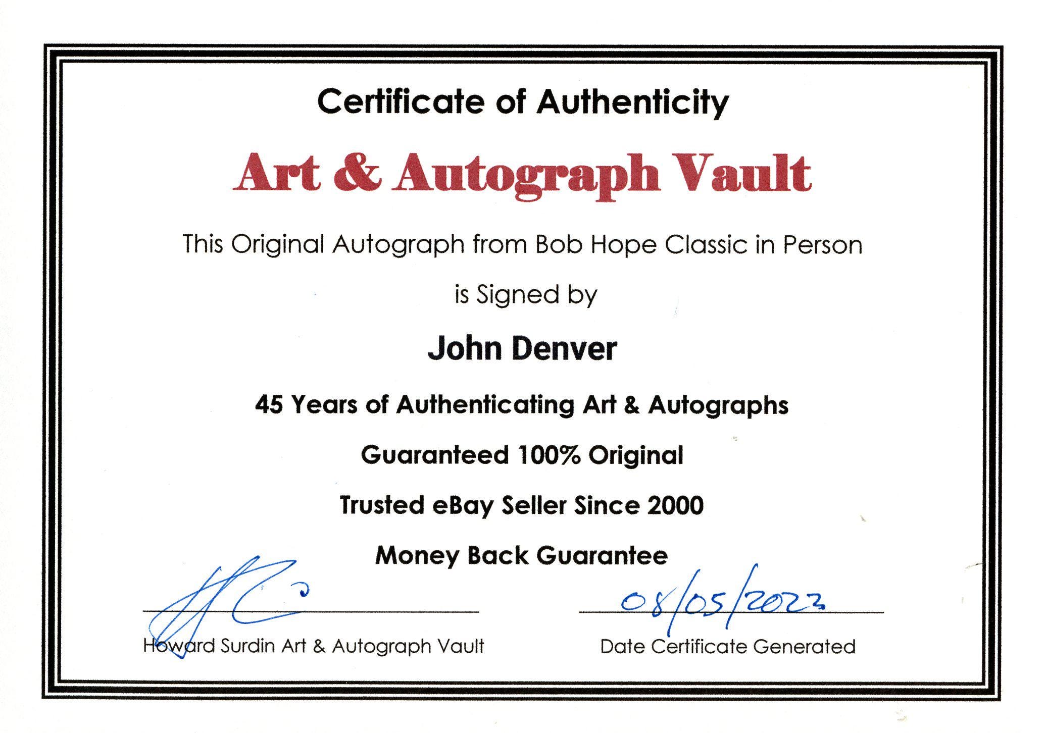 In person Autograph signed by John Denver at the Palm Springs Bob Hope Classic Golf Tournament.