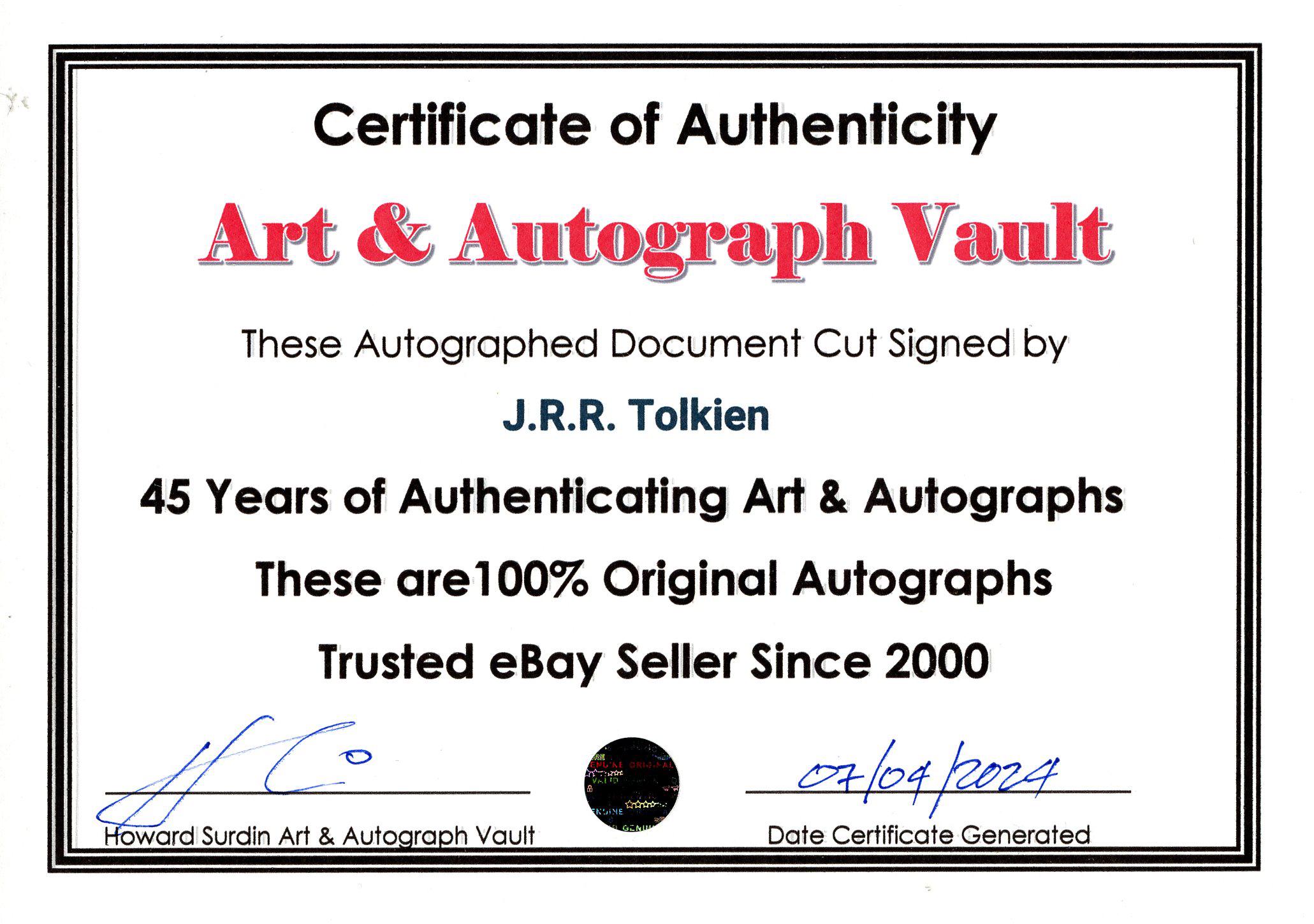 Double Matted Autograph Book Cut is signed with an original Signature of J R R Tolkien (Not a Copy)