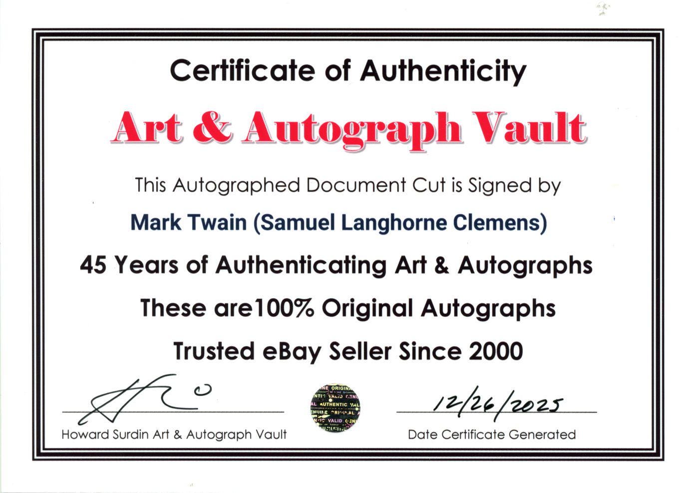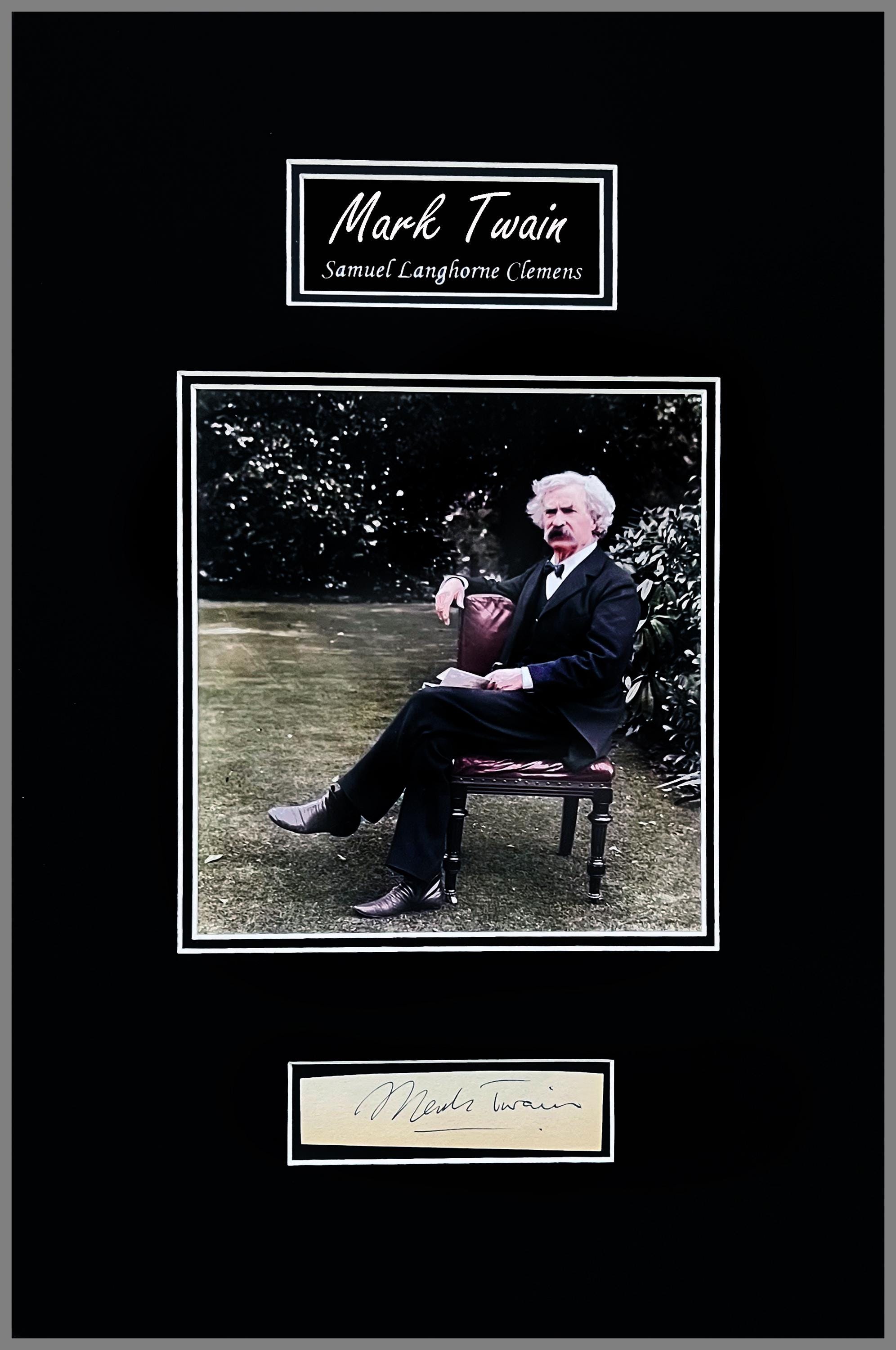 Mark Twain (Samuel Langhorne Clemens) Signed Document Page Cut Double matted and is signed with the original signature of the following: Mark Twain (Samuel Langhorne Clemens)