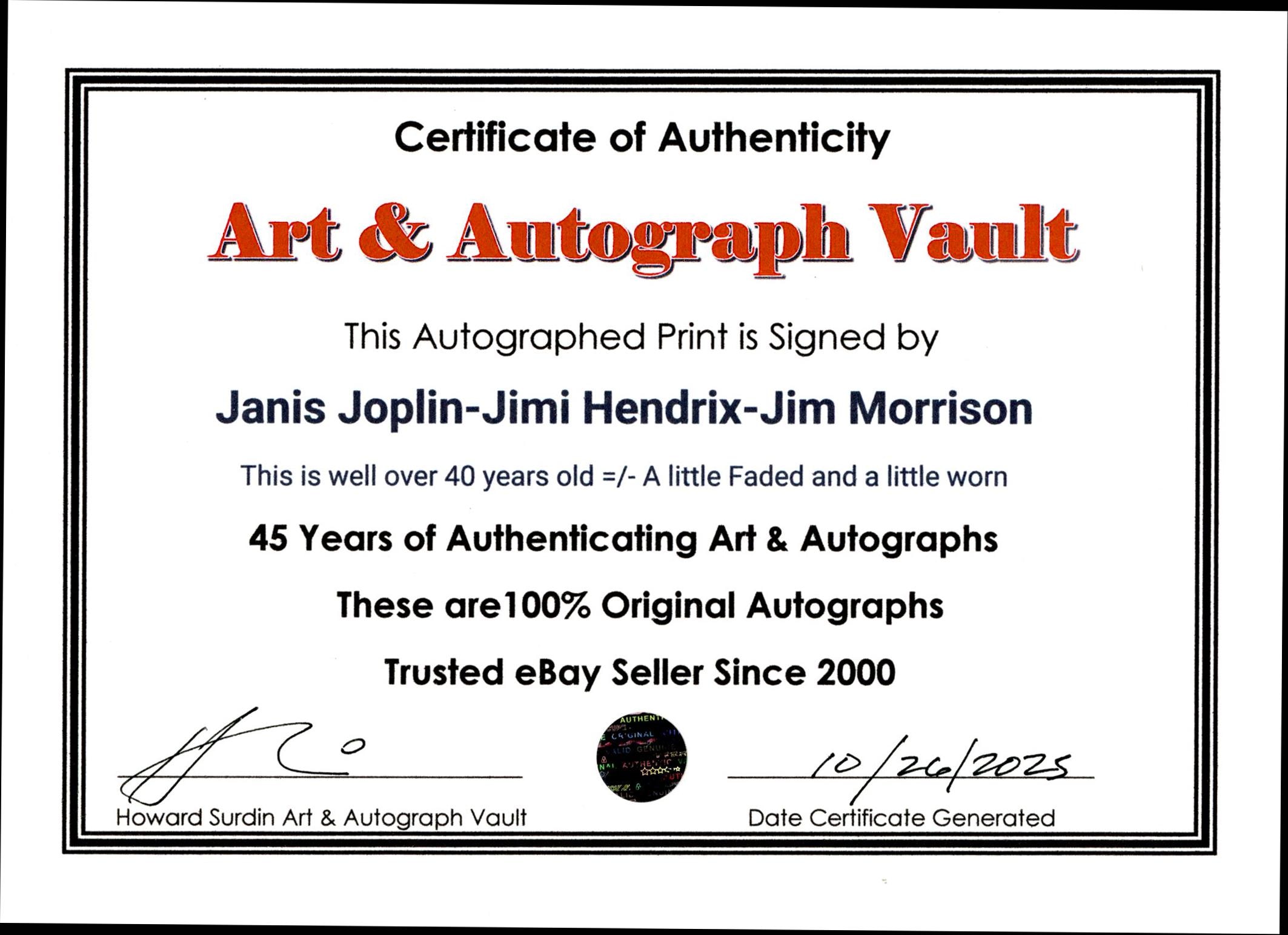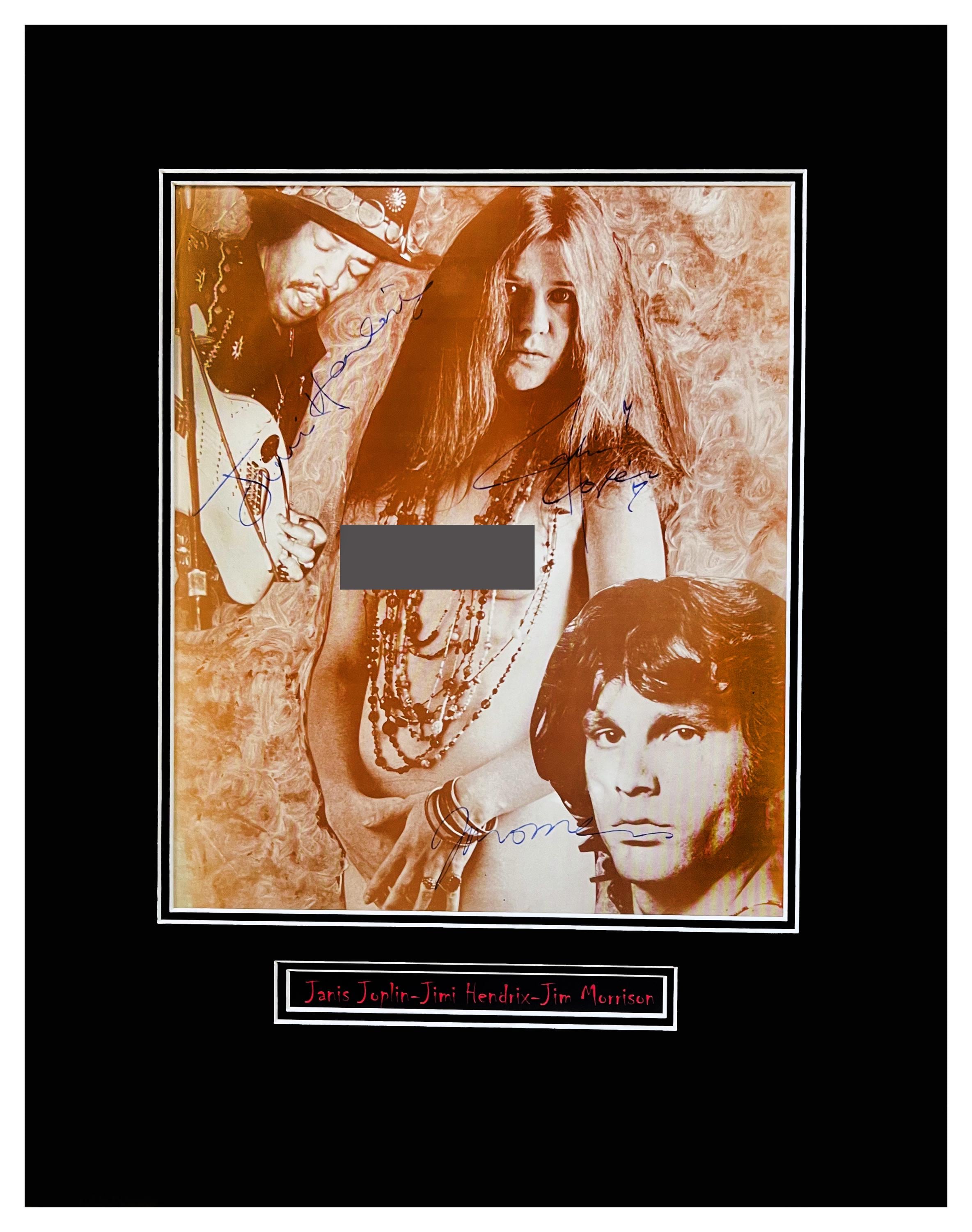 Double matted autographed small poster print is signed with the original signatures of the following: Janis Joplin-Jimi Hendrix-Jim Morrison