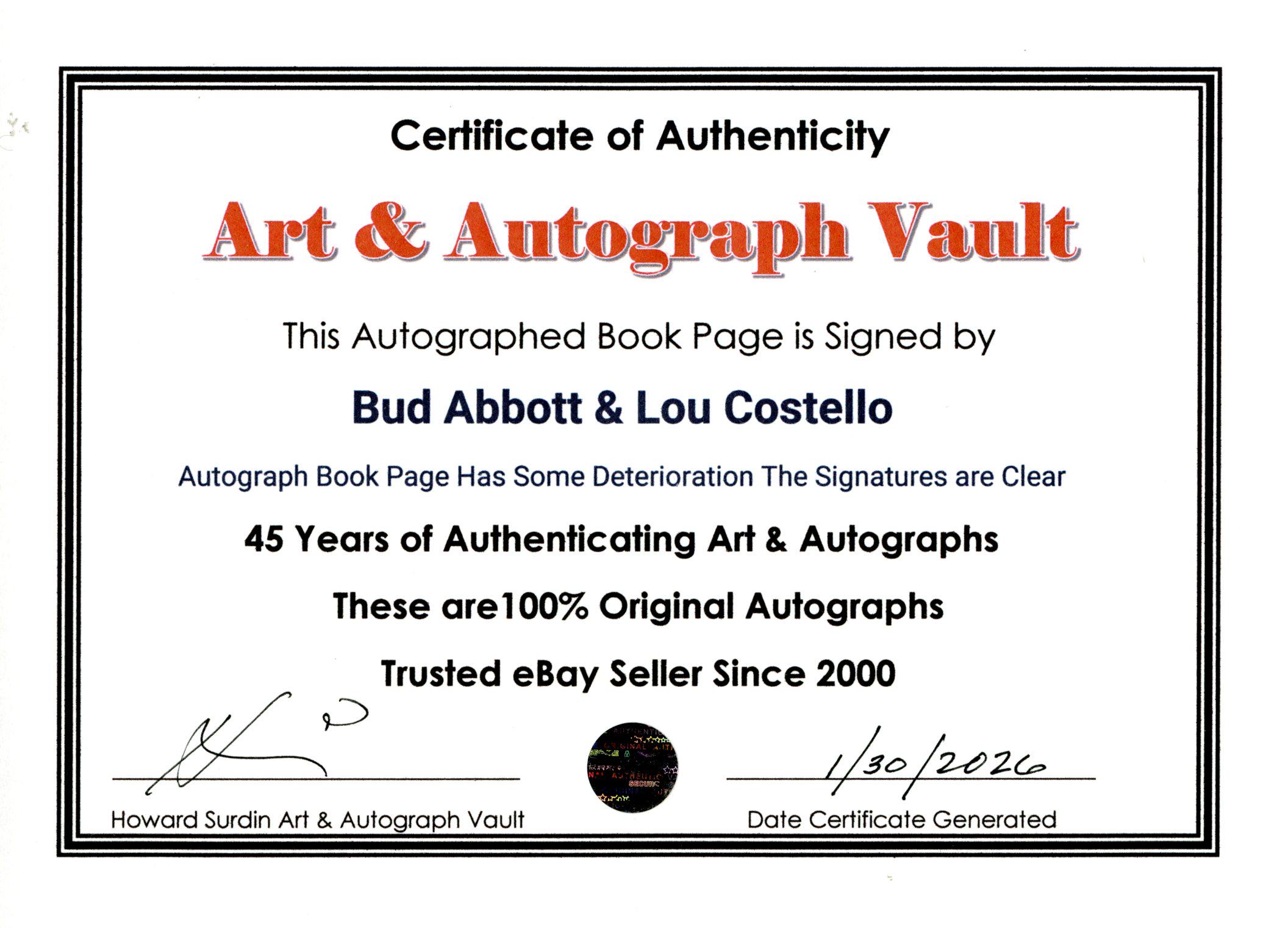 Bud Abbott & Lou Costello Autograph Book Page Museum Framed Ready to Display