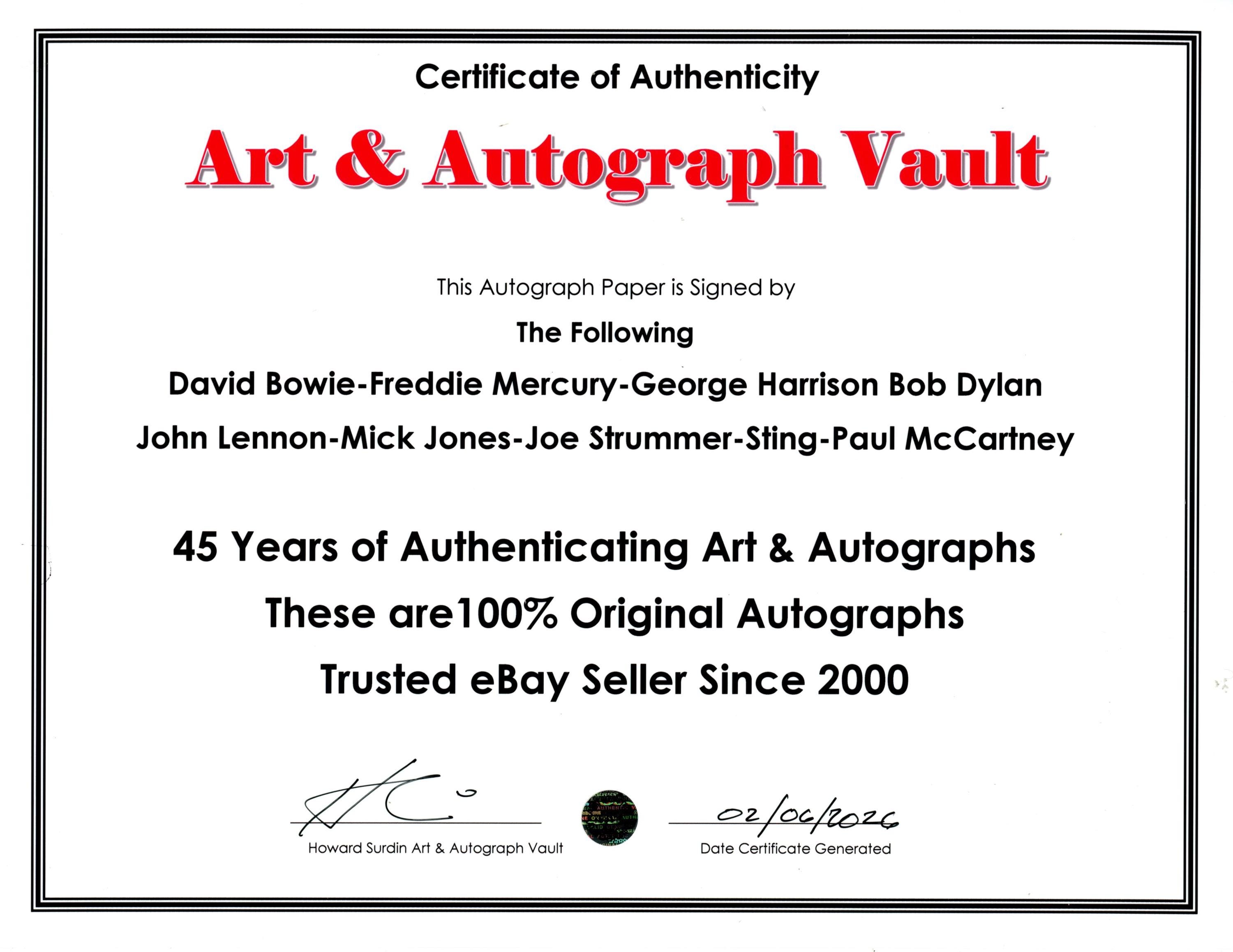 Double matted page cut with an original autograph of the Following: David Bowie-Freddie Mercury-George Harrison-Bob Dylan-John Lennon-Mick Jones-Joe Strummer-Sting-Paul McCartney