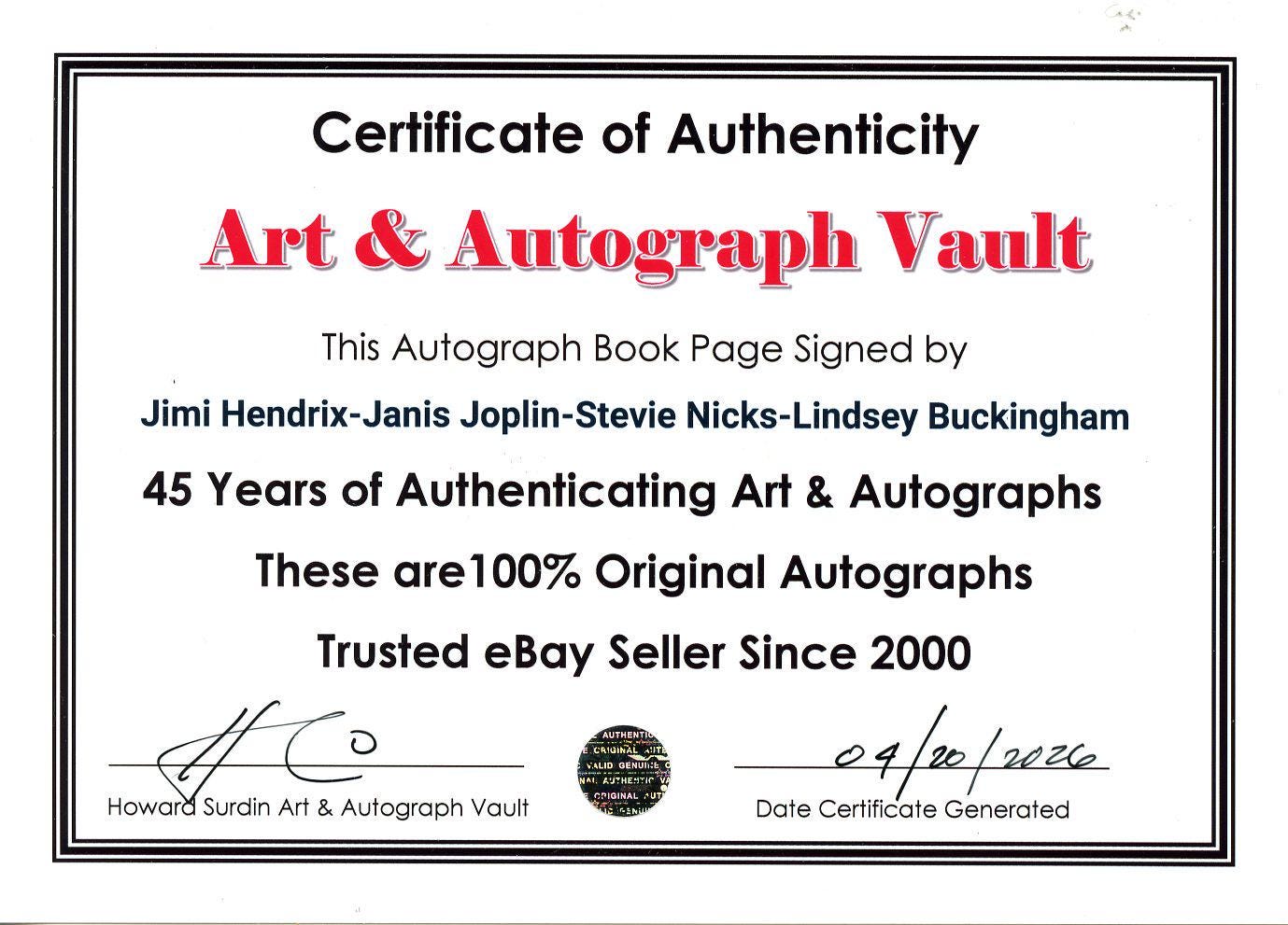 Jimi Hendrix-Janis Joplin-Stevie Nicks-Lindsey Buckingham Autographs