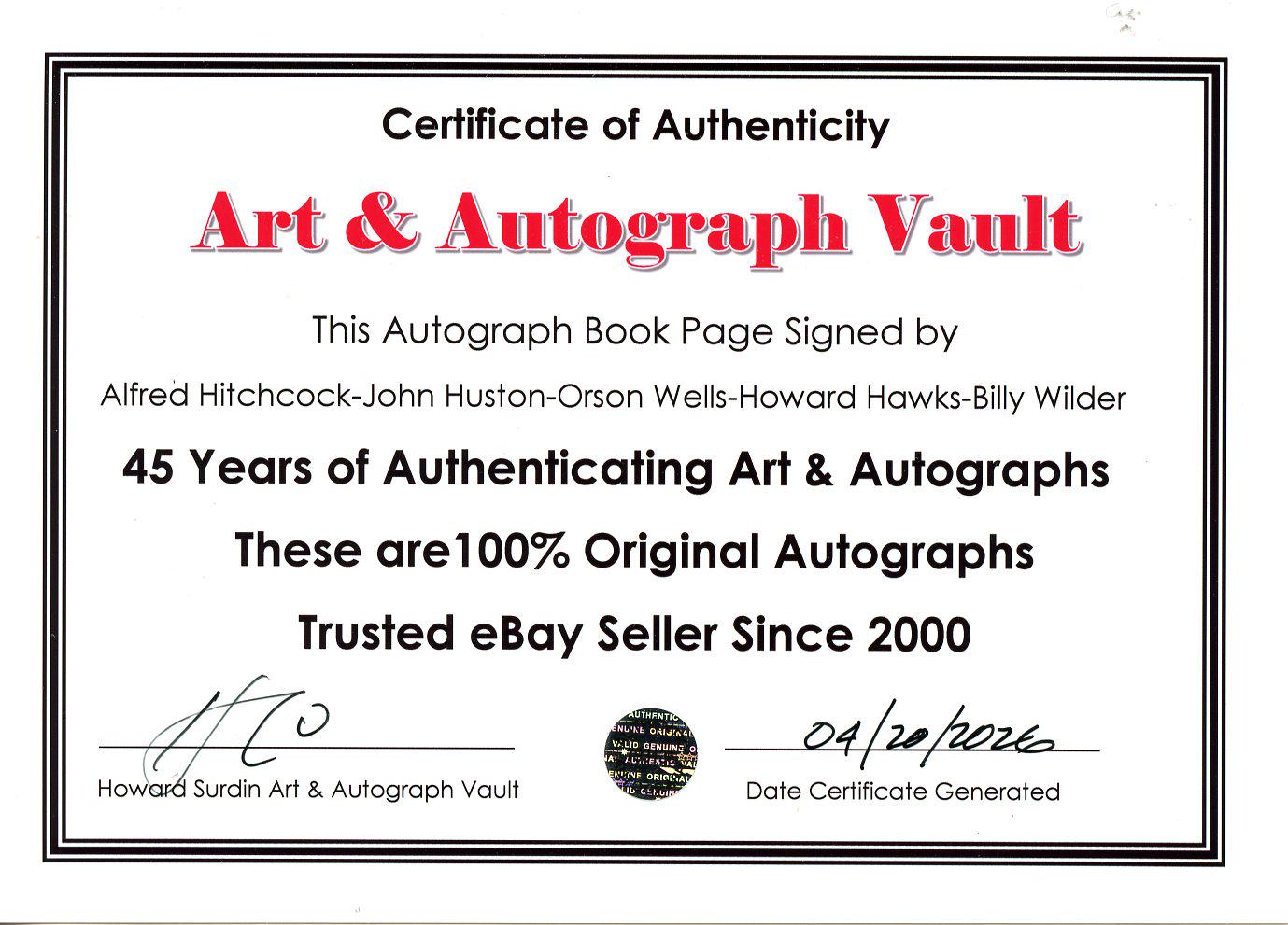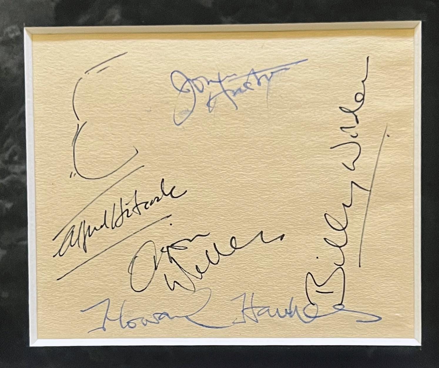 Double matted autographed Book Page Cut is signed with the original signatures of: Alfred Hitchcock-John Huston-Orson Wells-Howard Hawks-Billy Wilder